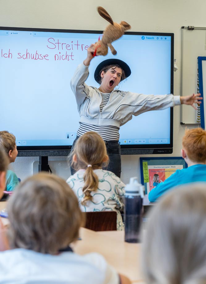 „Bei unserem Besuch waren die Kinder von Anfang an total gefesselt und saßen mucksmäuschenstill auf ihren Plätzen. Durch die wertschätzende und mitreißende Art der beiden Schauspieler hatten alle den Mut, sich aktiv einzubringen – so wachsen die Kinder über sich hinaus.“